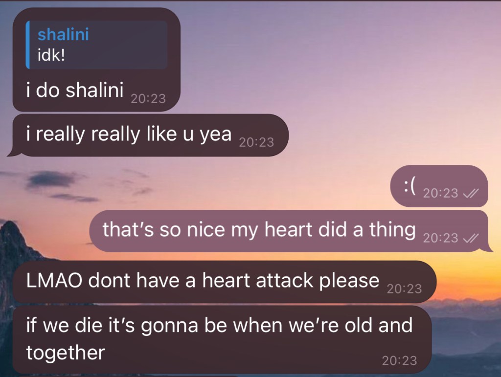 A while later, we suddenly got into the discussion of who should go first. We didn’t talk a lot about death and dying, but whenever we did, we meant dying when we were old. I said I’d want to go first, because I don’t think I could stand losing you. And you immediately said you’d want to go first for the exact same reason. I eventually gave in and said, “Fine… you can go first, but only when we are super old and wrinkly and I will come right after you.” This was another profession of love. One said, “I love you so much I can’t bear to live without you.” And the other said, “I love you so much I’d carry the pain of losing you, so you don’t have to.”