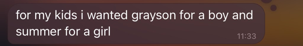 Josh and I adored these two names and have never considered any others since. As I write this, I am realizing that our daughter, Athena Summer, has a name born from love and heartfelt meaning. While our son, Grayson Romulus, was named after a couple of TV shows… albeit with some heartfelt meaning too (oops… We said no favoritism, Josh!).
