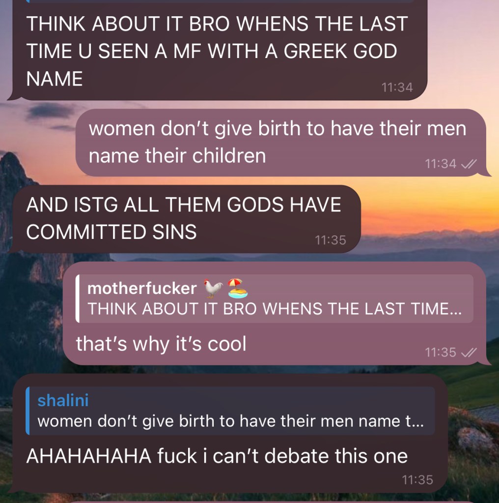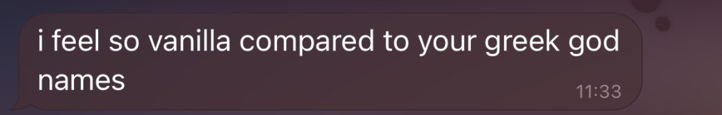 I then told him how I really fancy the names of Greek Gods – like Atlas, Hades, Artemis, Apollo, Hera, et cetera. Josh agreed that they sound nice, but followed with, “You do know how much Greek Gods have sinned, right? They aren’t exactly ‘good people’, you know?” I replied that I knew, but the names are unique and also have pleasant meanings like wisdom, fertility, protector… And he relented, but not before suggesting that we take turns naming the kids. I get one, and he gets one (equity theory, again!). I loved the idea of us both getting to choose the names we like. I added that our kids should have middles names like him and his sister, and he very readily agreed. We also decided that we’d alternate who picked which name; Sha names the first child’s first name, Josh names the first child’s middle name. Josh names the second child’s first name, and Sha names the second child’s middle name.