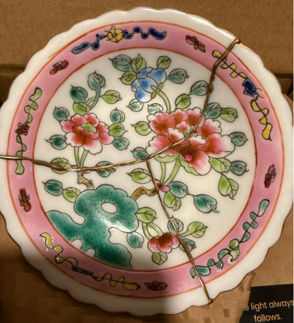 Hours later, we all completed our pieces, learning much more about each other. Shalini and her Gen Z attitude- “it’s nearly 5 minutes, it should be ok”. Me with my not so humble attitude- “see how beautifully it broke and came together”. And Aunty M, making a bit of a mess with the coppery gold powder at the back of her plate, and, “it’s just a plate”.