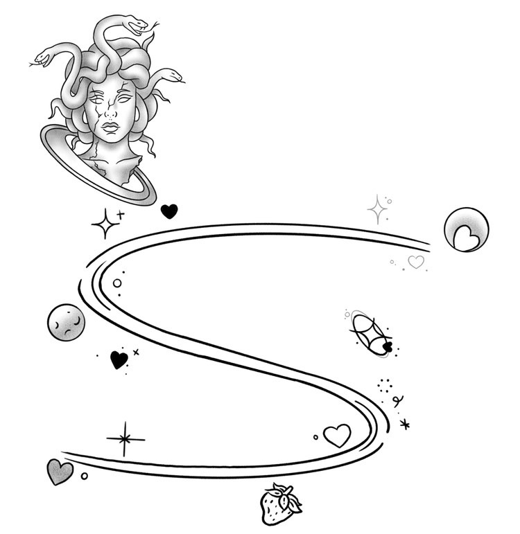 Shortly after, he came up with several designs. For my own reasons, I also wanted a Medusa tattoo with Josh’s adaptation, so I asked Josh to design her in his own style. The designs he showed me were super pretty and totally my style. It was about to be my favorite piece of art (how lucky am I that my boyfriend is both my favorite musician AND artist!). In October, I got the design done, with Josh right by my side, patiently waiting and still feeling honored that I’d chosen to get his work tattooed. He was honored? Imagine how I feel, carrying his artwork on my skin. Here is his design, and how it looks on my arm.