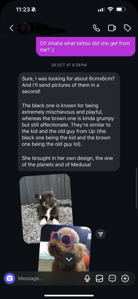 What I didn’t know then was that Josh also wanted a tattoo. At first, I worried that I had unintentionally influenced him, and told him multiple times that he really shouldn’t get one unless he really, really wanted to. But he told me that he’d been thinking about it for two years, long before he met me – he was just waiting for the right idea. After asking his mum and grandparents for permission and sharing the idea with his sister, he decided on a tattoo of Cadbury and Knight (the doggies). He contacted the artist and set an appointment for February 2025, texting me after to ask if I would come with him. But, as we know, he didn’t manage to get the tattoo.