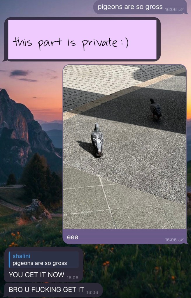 That’s what I think life is about, you know? To be loved and to love and to be seen and to see and have your life witnessed. To choose someone to spend the rest of your life with is essentially to say I choose you to witness every aspect of my life. And to want to be chosen by someone is also to say I want to witness every aspect of your life. Tell me about the waffles you will eat and the pigeons who will come too close to you. Tell me about every irritatingly mundane part of your day because I love you so much I want to be there for all of it. And I miss that. I miss having someone to do that with. I miss seeing and I miss being seen. And although friends and family do that sometimes, it’s different. Friends can see and family can see but it’s different. And it’s such a bonus that we get along so well – that I truly only want you to see. And I miss that. And I’ll keep missing that, like I said, for the rest of my life.