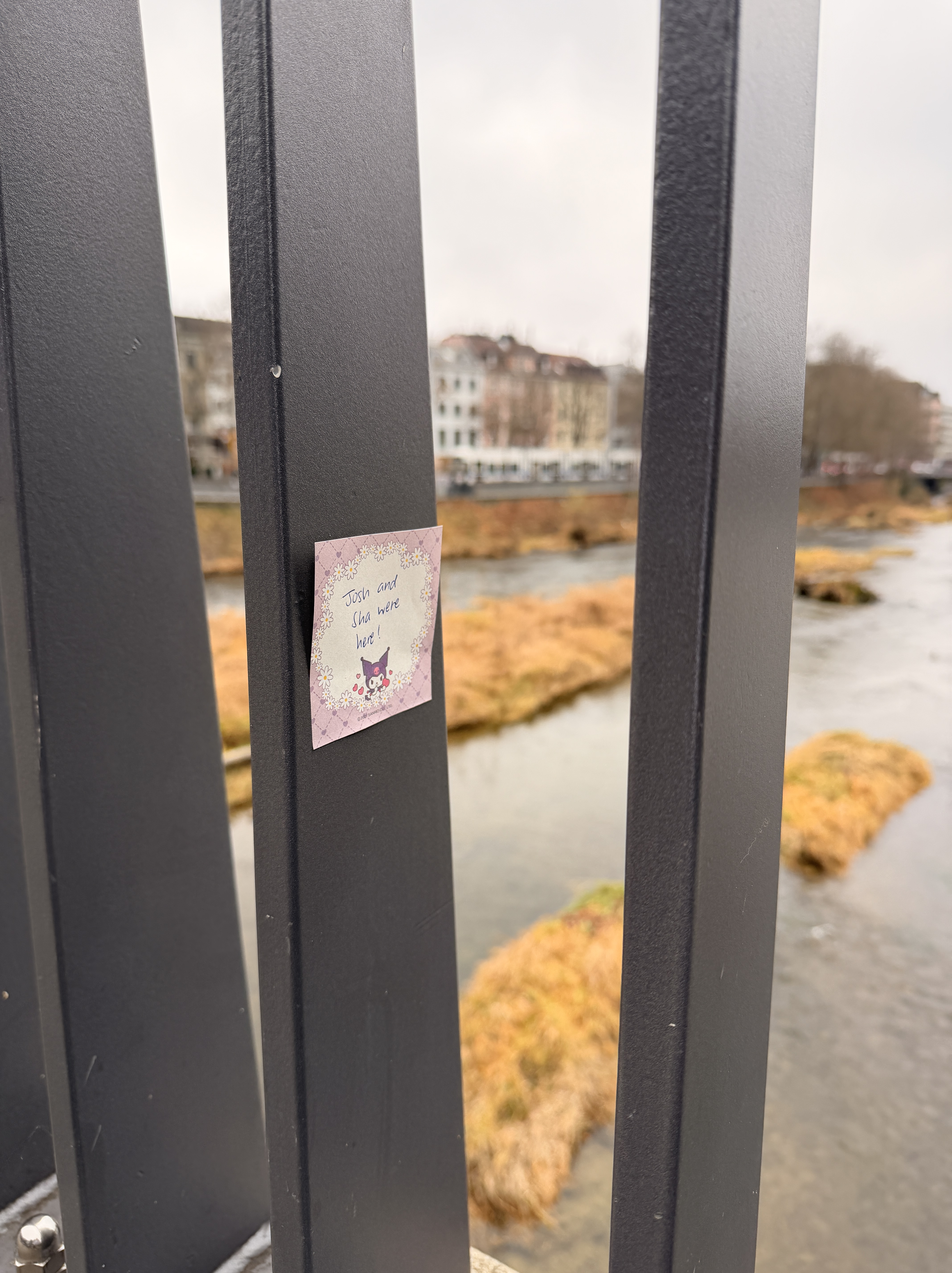 But, my girlfriend brain failed me again. Days before I left, I packed a little pencil case with several pens that allow nicer handwriting on these ribbons, a ruler to measure an appropriate length for each ribbon, and a pair of scissors. When I got to my hotel on my first day in Zurich, I could not find the pair of scissors I packed! I was actually so disappointed in myself I wanted to cry. Thankfully, Switzerland is known for chocolate, cheese, and Swiss Army knives. I told my family about my little purple ribbon plan, and they suggested looking around for a good knife instead of just buying the first one I saw. The only reason I agreed to hold off on buying the first knife I saw was because in my little pencil case, I had also packed purple (Kuromi) post-its, just in case I ran out of ribbons.