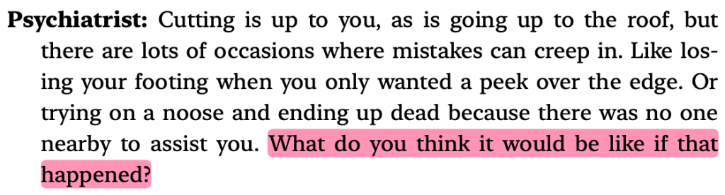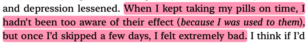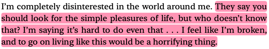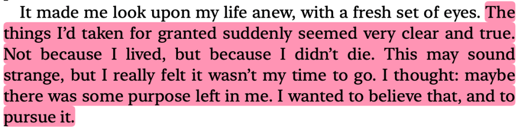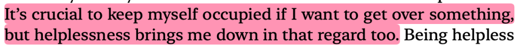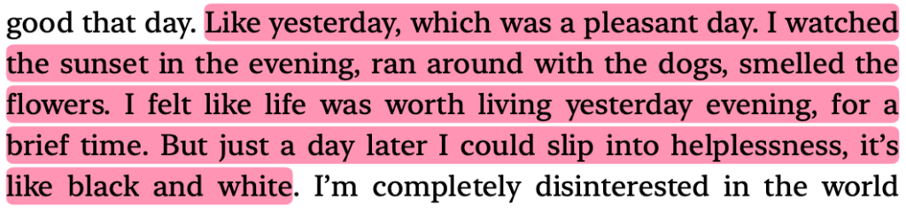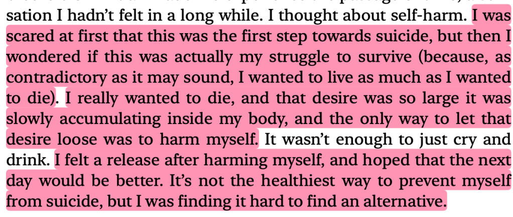 This is the first line I highlighted. I desperately wanted to know if your therapist asked you this question too and what your answer was. In the book, Baek talks about wanting to die and going up to the roof, cutting herself, etc. Her therapist brings this question about accidental deaths into the conversation. I also wonder what you would have answered and if your therapist asked you this. Baek’s answer was that she’d just struggle to get the noose off, but her doctor tells her that usually the more you struggle, the more the noose tightens. I got worried here, because what if you didn’t mean to die? Adding this to the list of things I wish your therapist said to you.I thought of you here too. Is this what you felt? “…I wanted to live as much as I wanted to die.” I don’t doubt that you wanted to live too, but I wish it overpowered your desire to die. “…the only way to let that desire loose was to harm myself.” Reading this book made me feel so sad for everyone with mental health struggles. I truly don’t know how I could have helped you. I wish I had known how to help you.I remember you telling me something like that too towards the end of December – that good days don’t last because the next bad thing will come. In hindsight, it feels like you were just living to fight the bad days. I can see why it would have been exhausting for you. Reminded me of something you said too. Reading this book helped me understand why it was so difficult for you to look forward to the future when you were having a bad time. Don’t get me wrong, you were looking forward to the future most of the time, but when BPD would take over, it would be really hard to convince you to look forward to better days. I feel so sorry that this was similar to what you went through. You have said this before. It was heartbreaking then when I heard it, and it is still heartbreaking now to read it from someone else. This was also something you mentioned. You said that when you were younger, you stopped taking your pills because you felt fine but plummeted almost instantly and you never stopped taking your pills again. You’ve had multiple near-death experiences and I wish you felt this way long enough to keep you here. This made me think about your perception. Did you also misunderstand certain things that ended up hurting you? It must have been so difficult for you. You might have known, deep down, that some things weren’t out to hurt you, but BPD must have clouded your lens. You identified this and told me about it too.