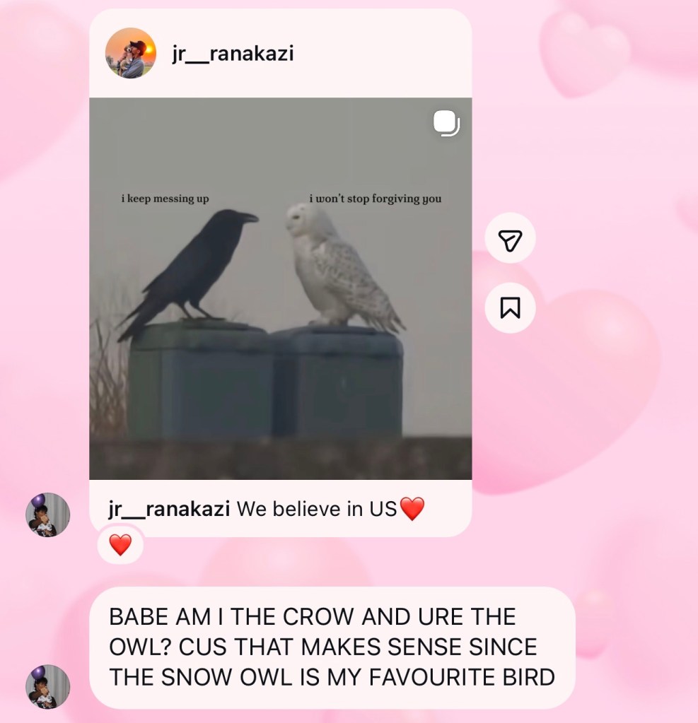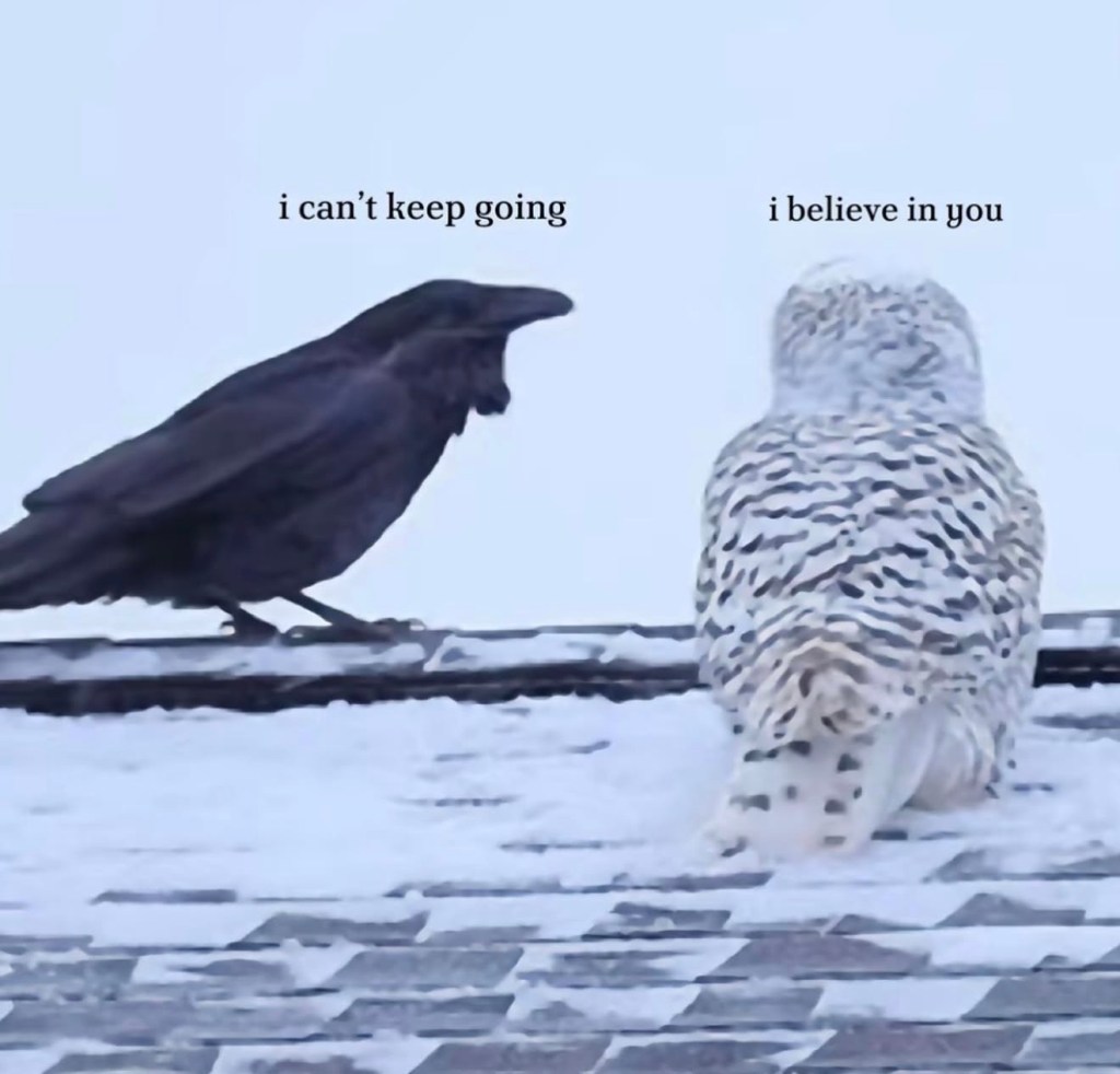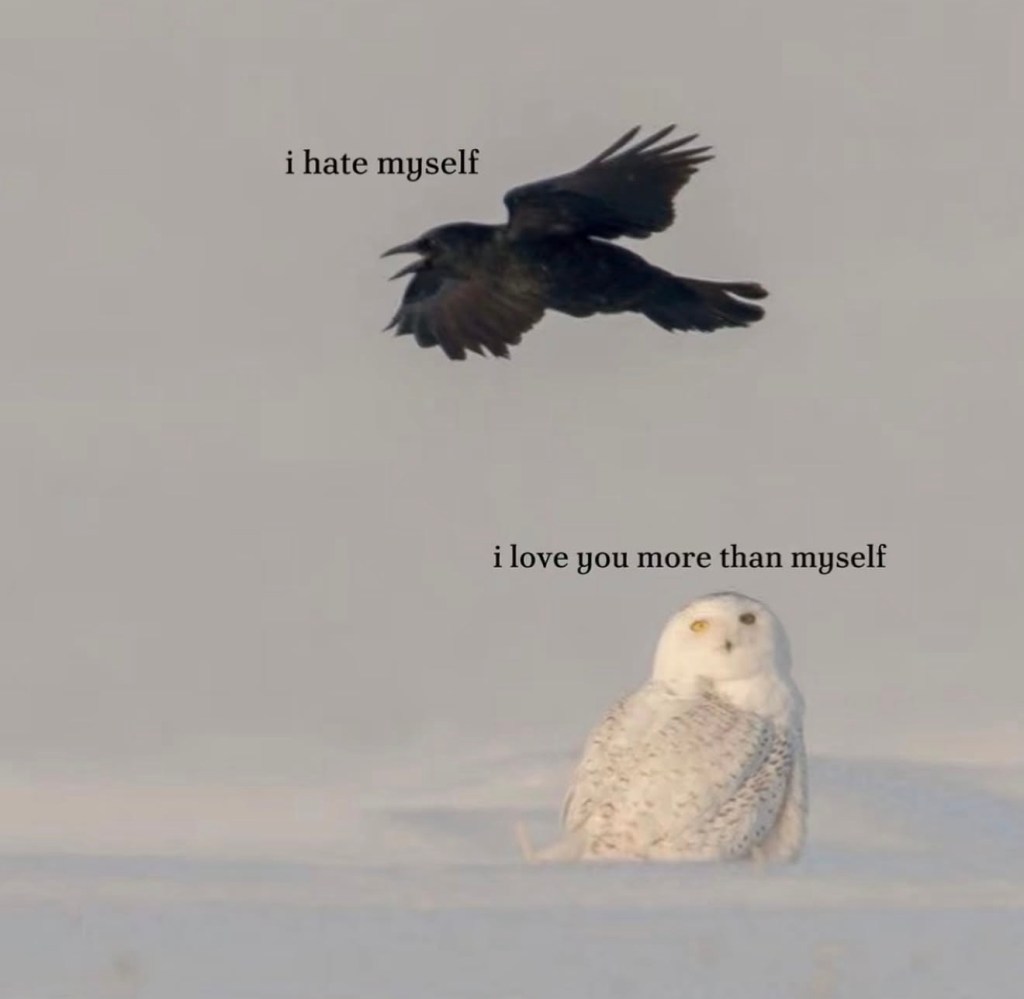 ^This is what you sent me on Instagram. It’s a series of images where the crow says something sad and the snowy owl comforts him.