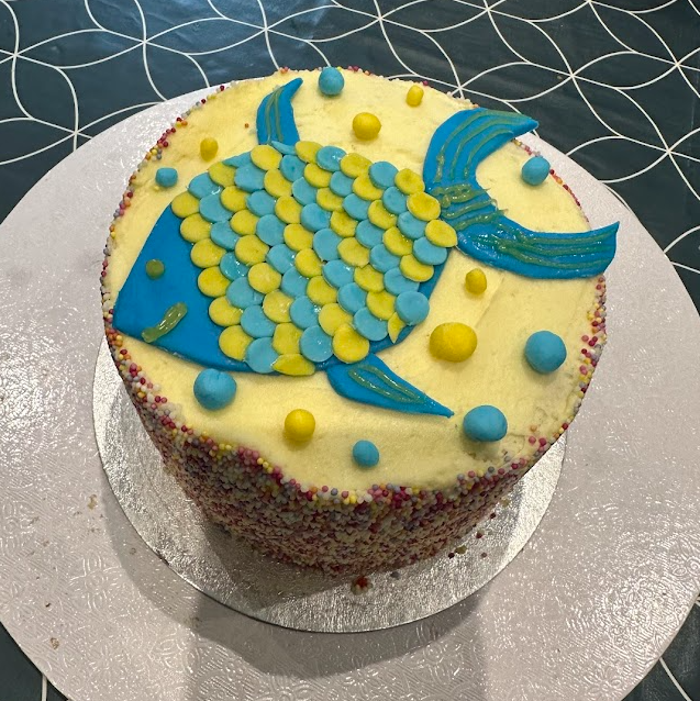 Jess decided she wanted a yellow and blue cake with fish, in tribute to you. Your cousins came with us to buy a rainbow cake and icing to make the fish. Uncle C stayed up late making the most beautiful “fish” to put on top of the cake.
